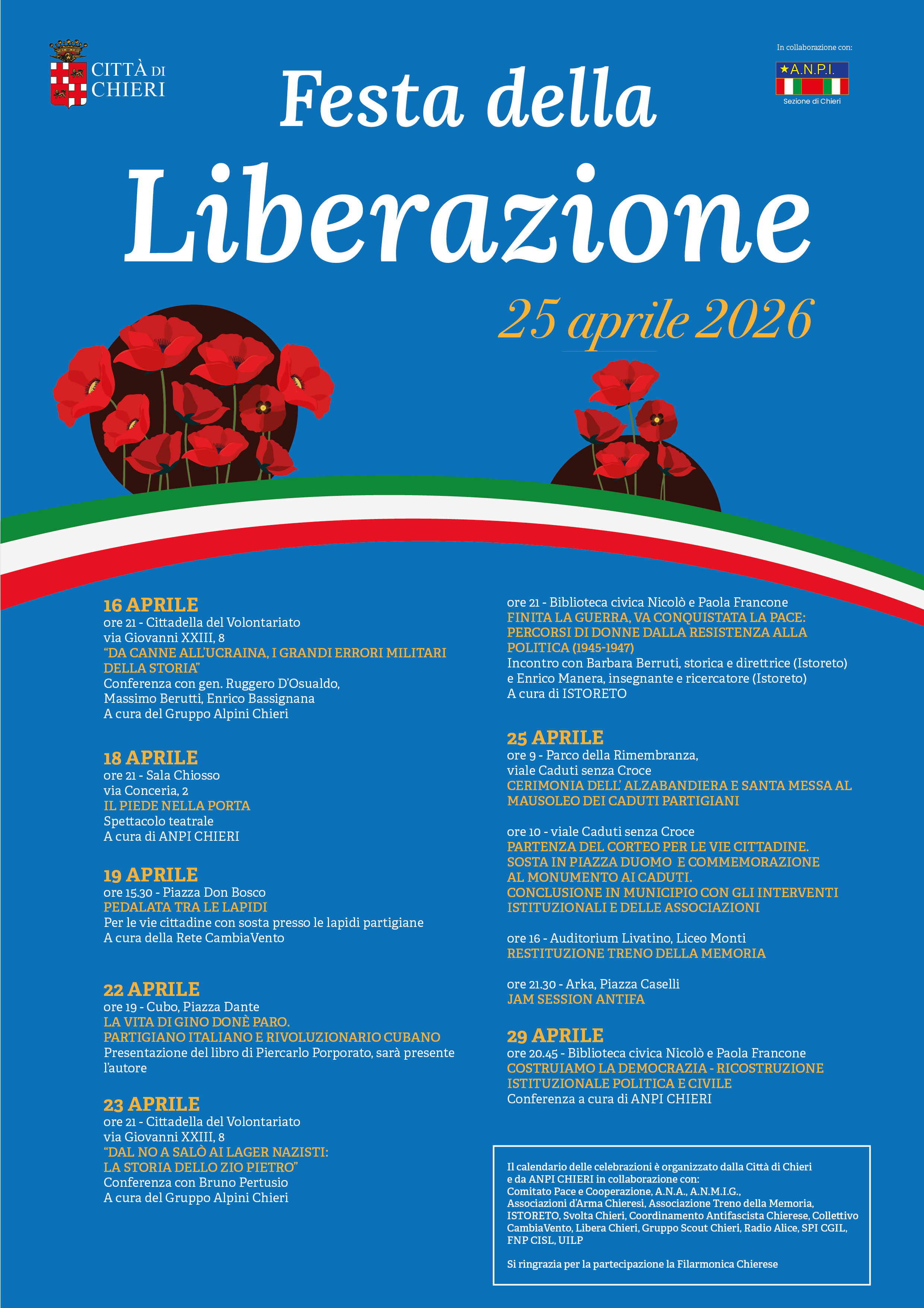 In occasione dell’81° anniversario della Liberazione, la Città di Chieri, in collaborazione con ANPI – Sezione di Chieri, promuove un ricco programma di iniziative per ricordare i valori della Resistenza, della libertà e della democrazia.