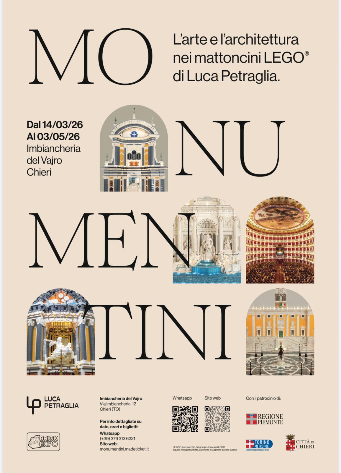 Dopo il recente grande successo di pubblico registrato al Museo Vignoli di Seregno (Monza -Brianza), da sabato 14 marzo a domenica 3 maggio 2026 la Città di Chieri ospiterà presso l'Imbiancheria del Vajro la mostra “MONUMENTINI” organizzata da Brick Expo.